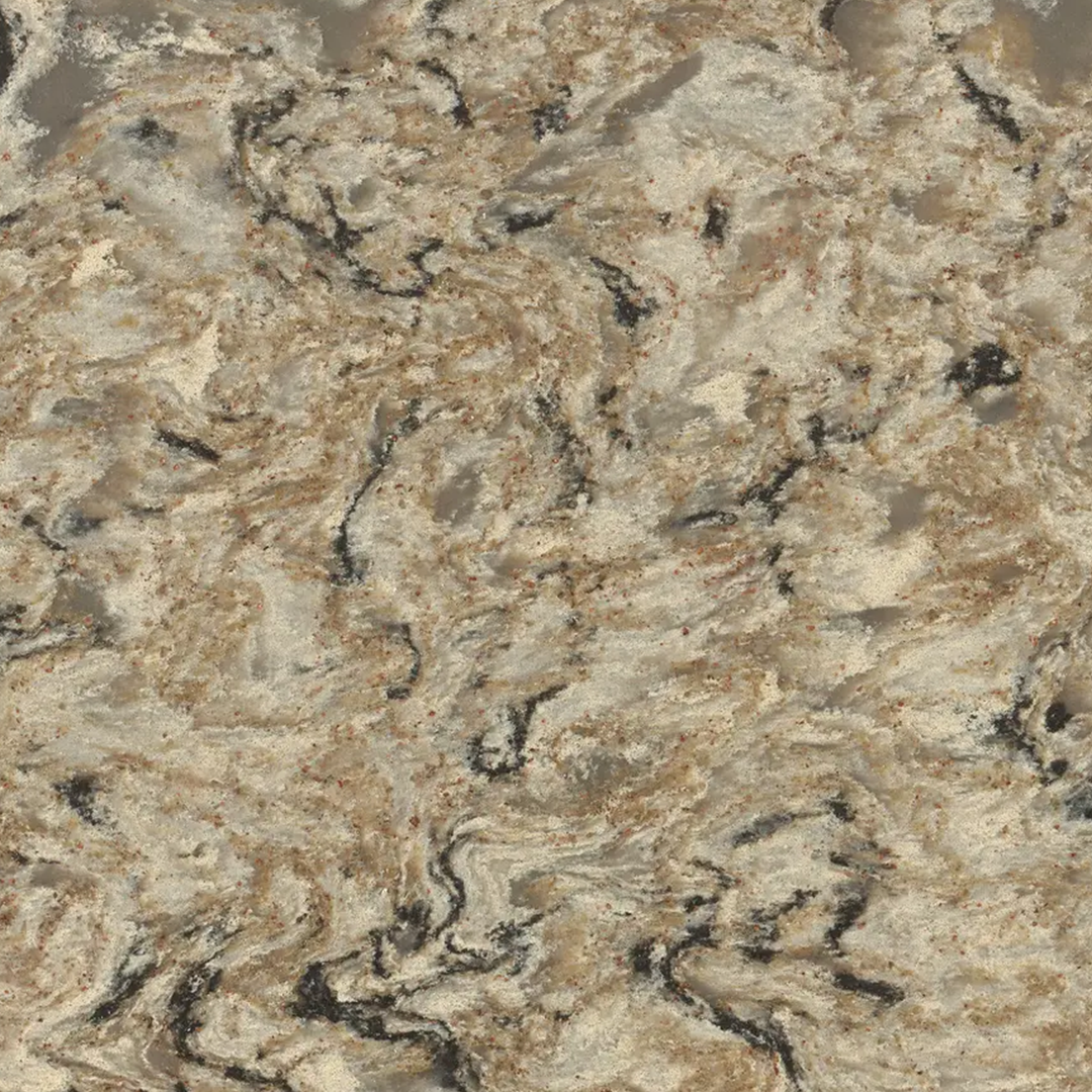 Un diseño terroso y sofisticado que combina taupe y tonos arena con vetas negras y motas de cobre que capturan la luz con elegancia. Este cuarzo es no poroso, resistente a manchas y requiere mantenimiento mínimo, ideal para cocinas, baños y espacios con estilo contemporáneo.
