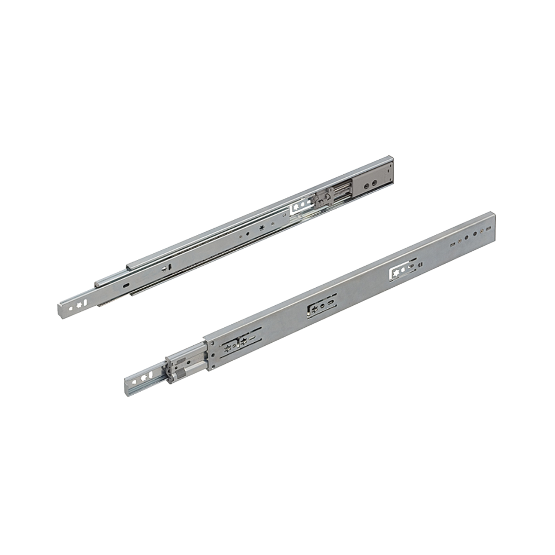 Corredera de cajones con extensión parcial, fabricada en acero resistente y con capacidad de carga de hasta 45 kg. Su montaje lateral permite un deslizamiento suave y estable, garantizando durabilidad y funcionamiento silencioso en muebles de uso residencial o comercial.