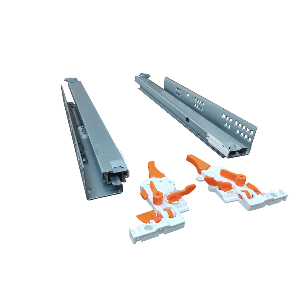 Corredera de cajón con extracción total y fácil montaje gracias a su sistema clip. Instalación basal donde el mecanismo completo queda oculto por debajo del cajón. Posee cierre suave y su deslizamiento opera en base a rodillos.