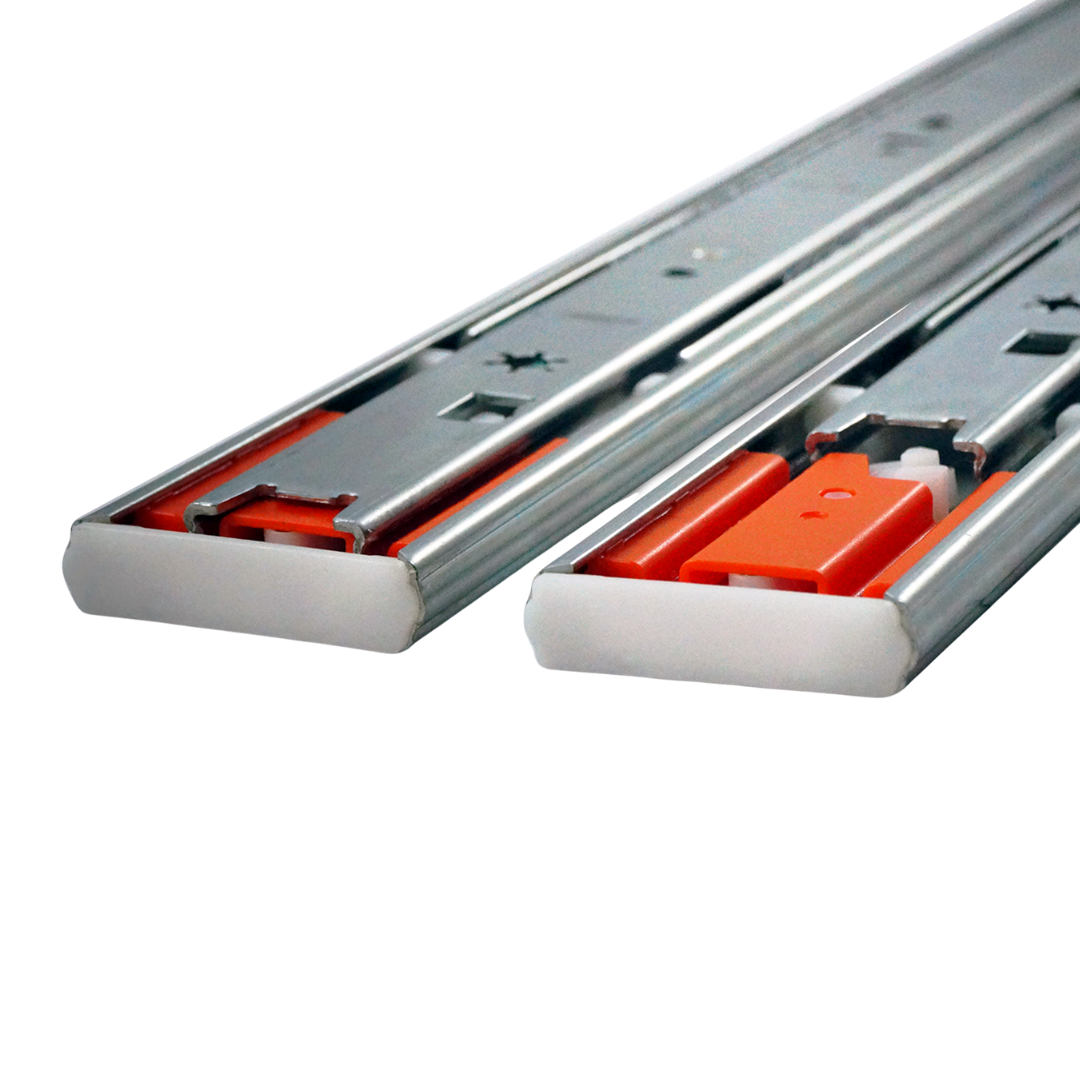 Corredera telescópica de extracción total, con rodamientos de balín en línea y montaje en el lateral del cajón. Permite la apertura del cajón haciendo presión en la parte frontal, prescindiendo de jaladeras. Montaje o desmontaje fácil del cajón gracias a su sistema clip.