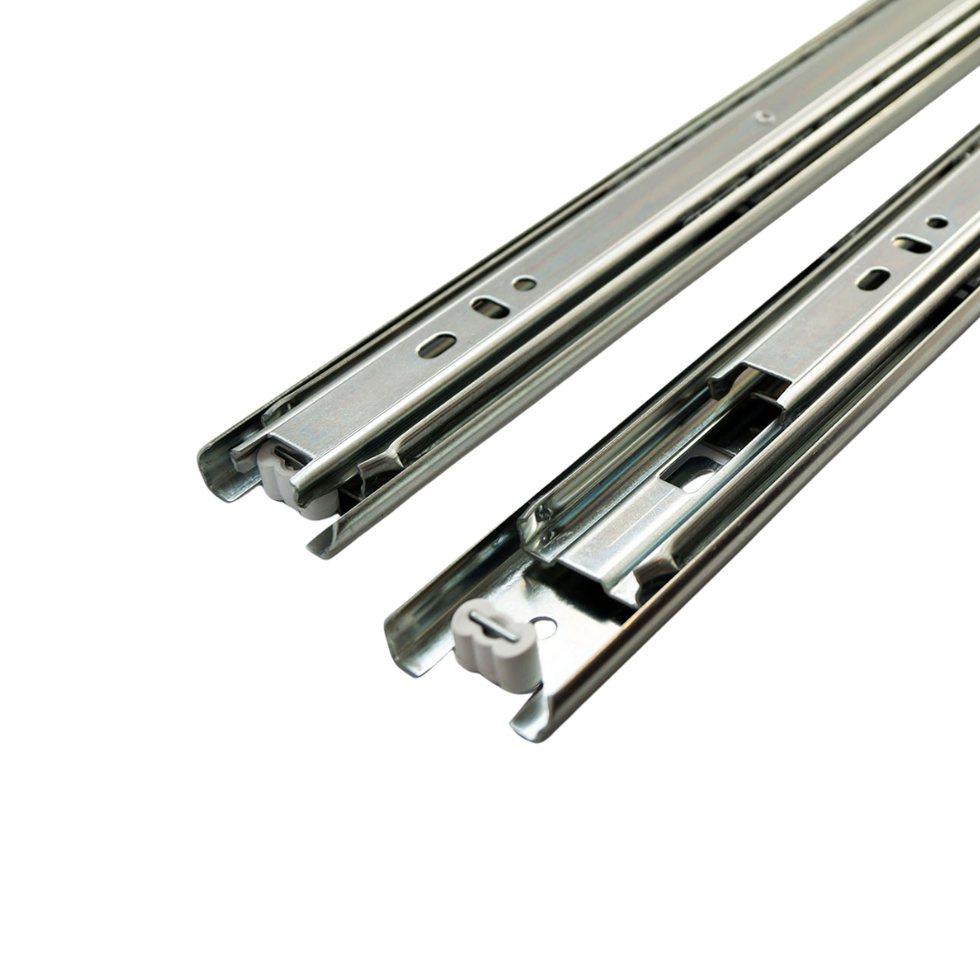 Corredera telescópica de extracción total. Mayor resistencia gracias a que posee un tercer balín de acero por sección. Montaje o desmontaje fácil del cajón gracias a su sistema clip.