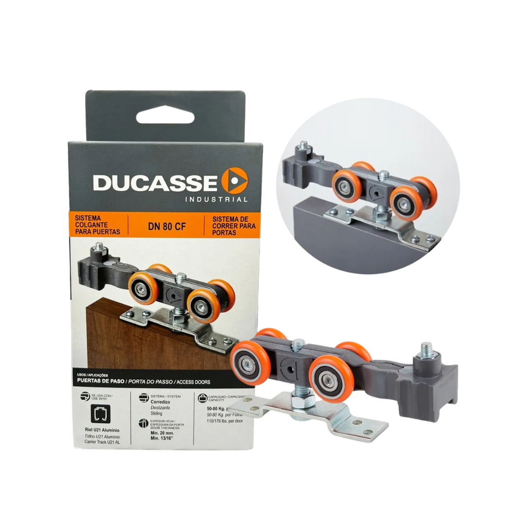 DN 80 CF es un sistema corredizo colgante con freno para puertas de paso de madera o metal, con capacidad de carga de 50 a 80 kg por hoja, montaje frontal y compatibilidad con puertas de mínimo 20 mm de espesor. Su mecanismo incluye rodamiento de gama premium y riel de aluminio, lo que garantiza un deslizamiento suave, silencioso y un cierre óptimo sin rebotes.