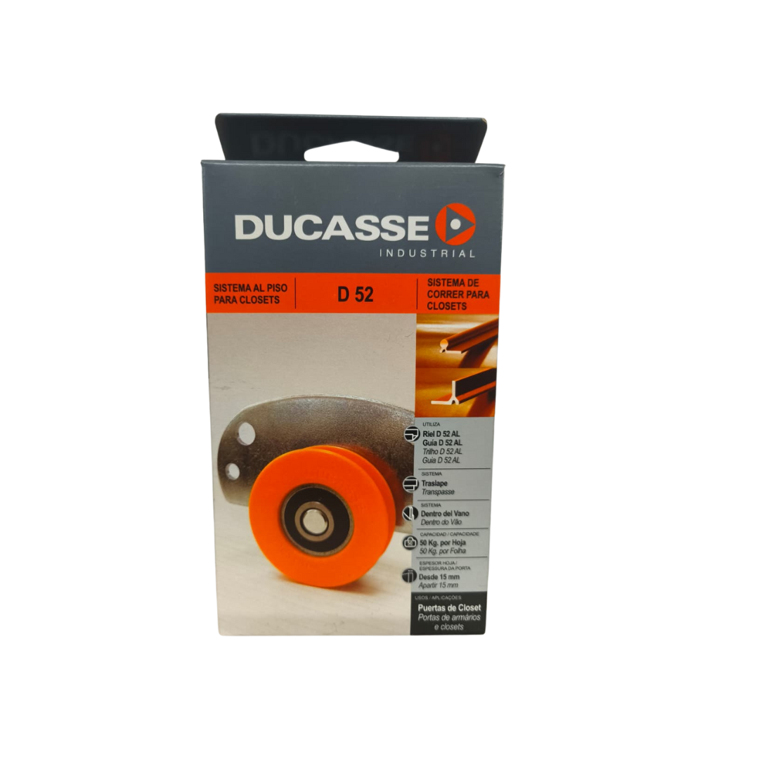 Sistema corredizo al piso para puertas de clóset, apto para 2 hojas de madera; soporta entre 15 y 50 kg por hoja, con espesor mínimo de puerta de 15 mm y ancho desde 650 mm; permite instalación embutida o sobrepuesta, ajustando el traslape entre puertas, con opción de carro sobrepuesto (sin necesidad de mecanizado) o embutido (para mínima separación entre puertas); ofrece un deslizamiento suave, silencioso y duradero gracias a su riel y guía de aluminio, incluye carro, guías superiores y tope — ideal para closets residenciales o muebles empotrados con puertas corredizas
