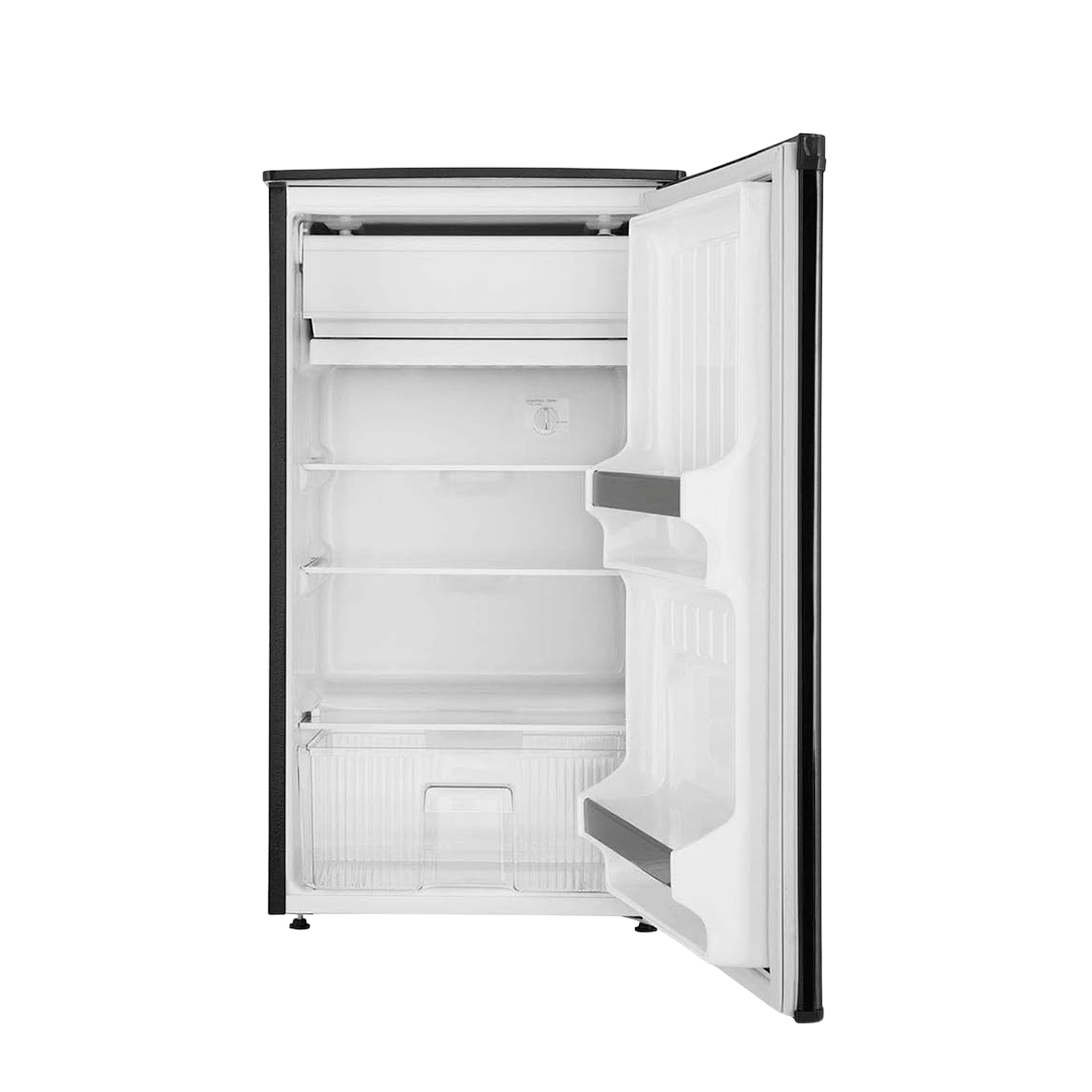 Frigobar Gris RMF0411YMXS1 compacto de 93 L con puerta reversible, freezer superior y 2 parrillas de cristal. Su diseño moderno en gris metálico es ideal para oficinas o recámaras, con alto ahorro de energía y fácil organización de alimentos y bebidas.