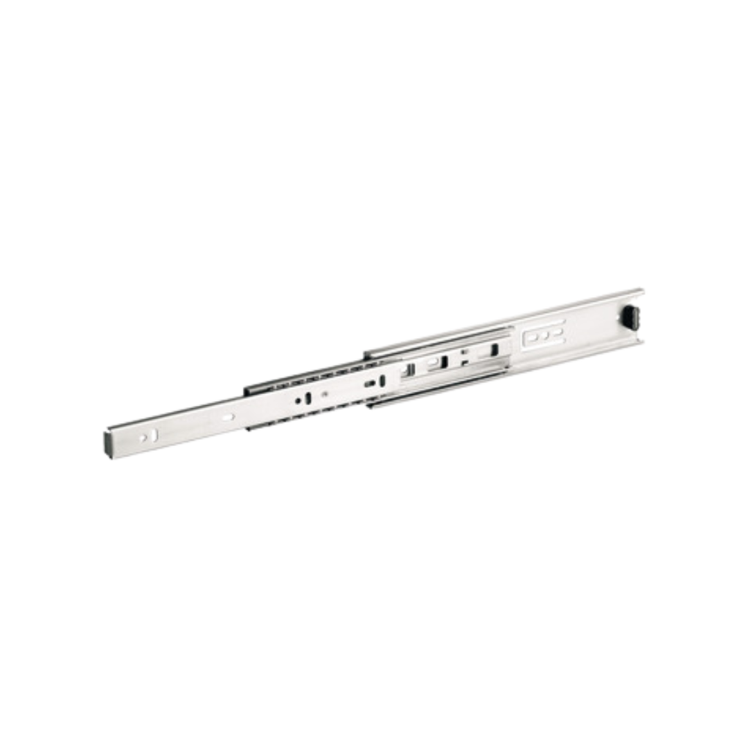 Guía de bola con corredera de extensión total, fabricada en acero inoxidable, capaz de soportar hasta 34 kg. Su montaje lateral permite una instalación sencilla, ofreciendo un deslizamiento suave, silencioso y duradero, ideal para cajones y muebles de uso diario.