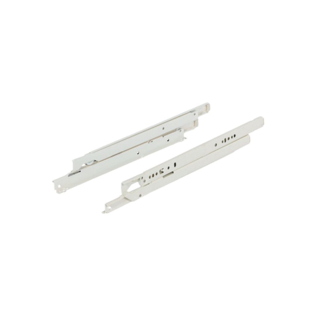 Guía de rodillos con corredera de extracción total, fabricada en acero resistente y con capacidad de carga de hasta 50 kg. Su montaje en superficie facilita la instalación, garantizando un deslizamiento suave y duradero, ideal para cajones y muebles de uso diario.