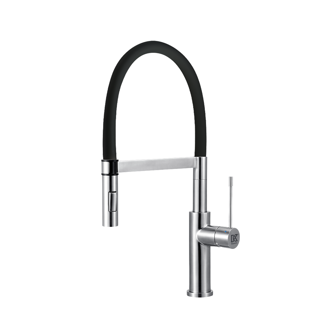 Llave KSS1215 fabricada en acero inoxidable 304, cuenta con cuello flexible de silicona en blanco o negro y cabezal de doble función (chorro y rociador). Su diseño moderno de 53 × 22 cm ofrece resistencia, practicidad y amplio alcance para tu cocina.