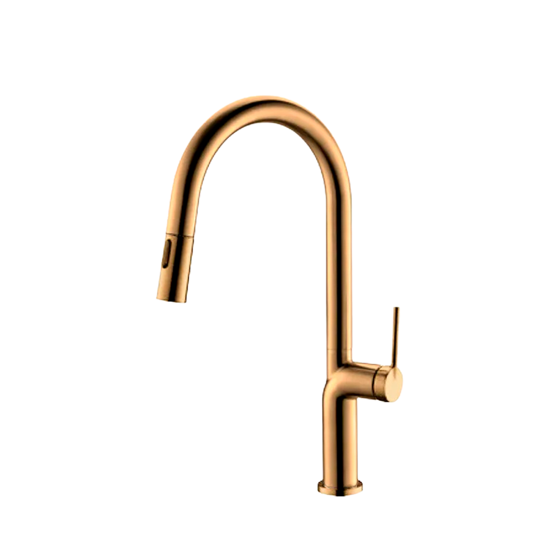 Llave KSS1234 GD acero inoxidable 304 con un elegante acabado dorado PVD. Su diseño de cuello alto redondo y cabezal extraíble de doble función (chorro y rociador) ofrece un alcance de 41 × 24.5 cm. Ideal para cocinas modernas que buscan estilo y funcionalidad.