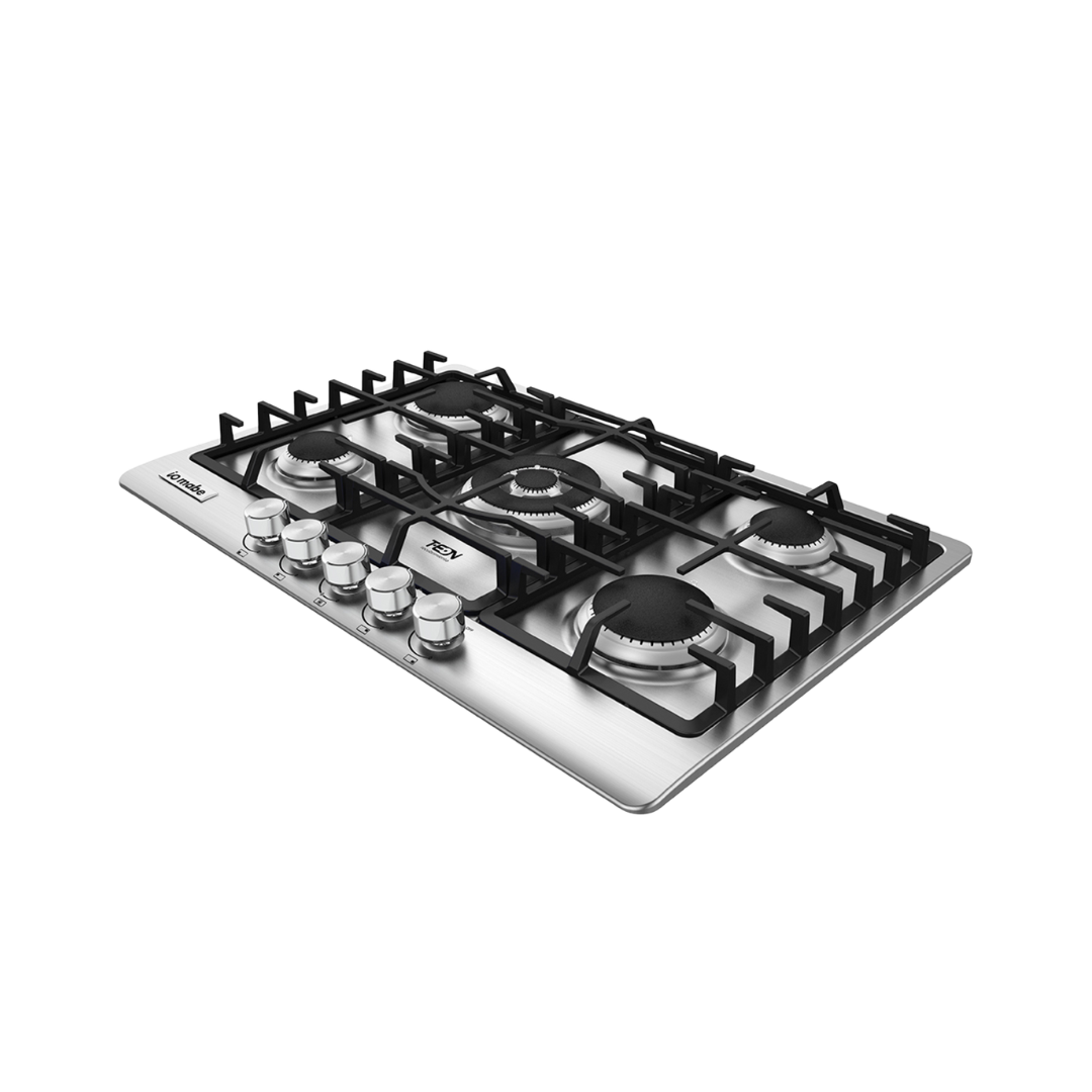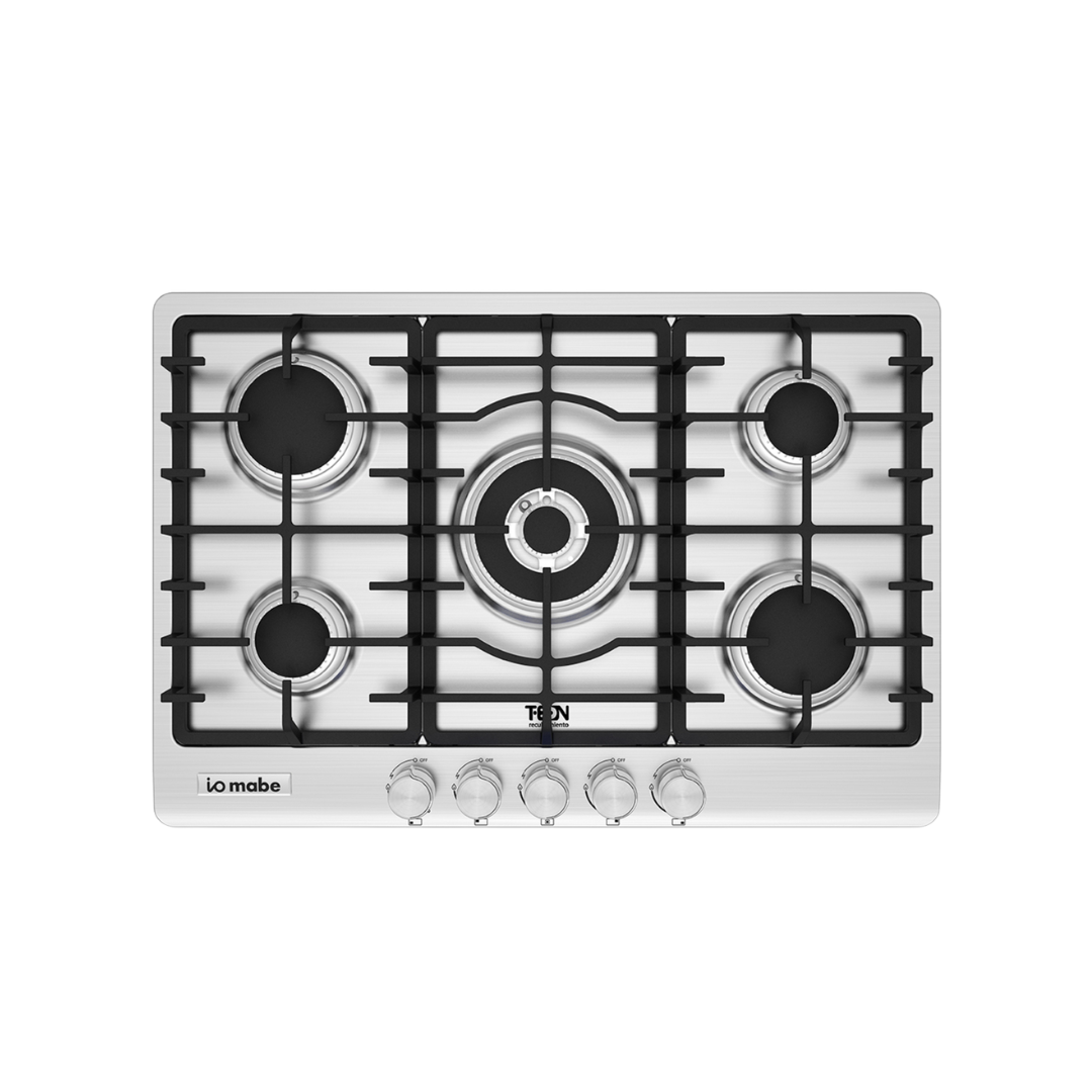Parrilla empotrable de 76 cm ideal para cocinas modernas, con cinco quemadores (incluyendo quemador central tipo Professional Ring de triple flama) que permiten desde un hervor suave hasta cocción rápida y potente. Está construida en acero inoxidable con recubrimiento TEON (tecnología nano-cerámica que evita que el acero se amarillee), tiene encendido electrónico integrado, perillas iluminadas para mayor seguridad, sensor de flama en cada quemador, y tres parrillas de fundición.