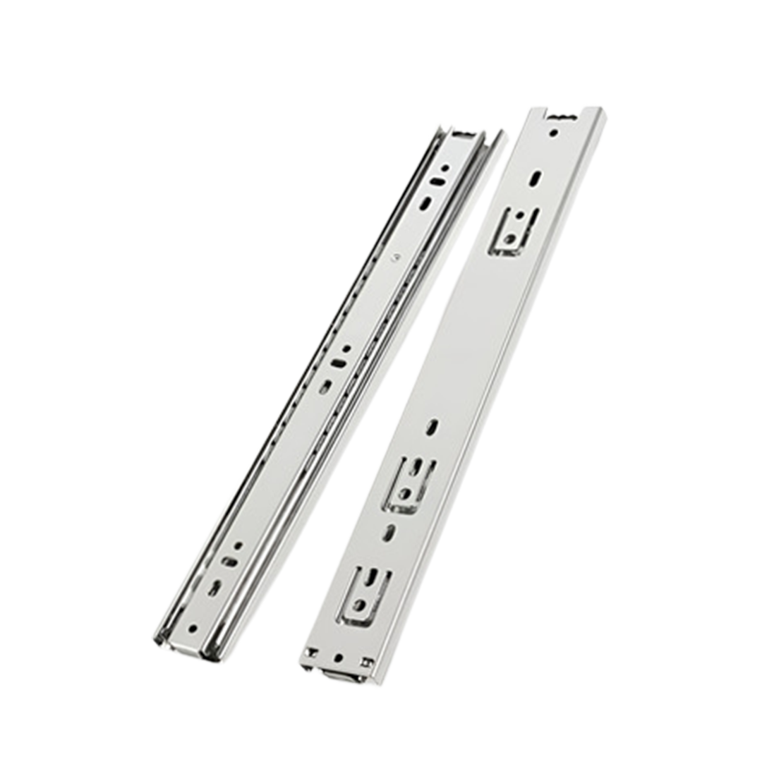 Riel con cierre suave y acabado zincado. Fabricado en acero rolado en frío, ofrece un deslizamiento fluido y seguro, apertura total y función antideslizante al extenderse por completo. Ideal para cajones de muebles que requieren un funcionamiento silencioso y duradero.