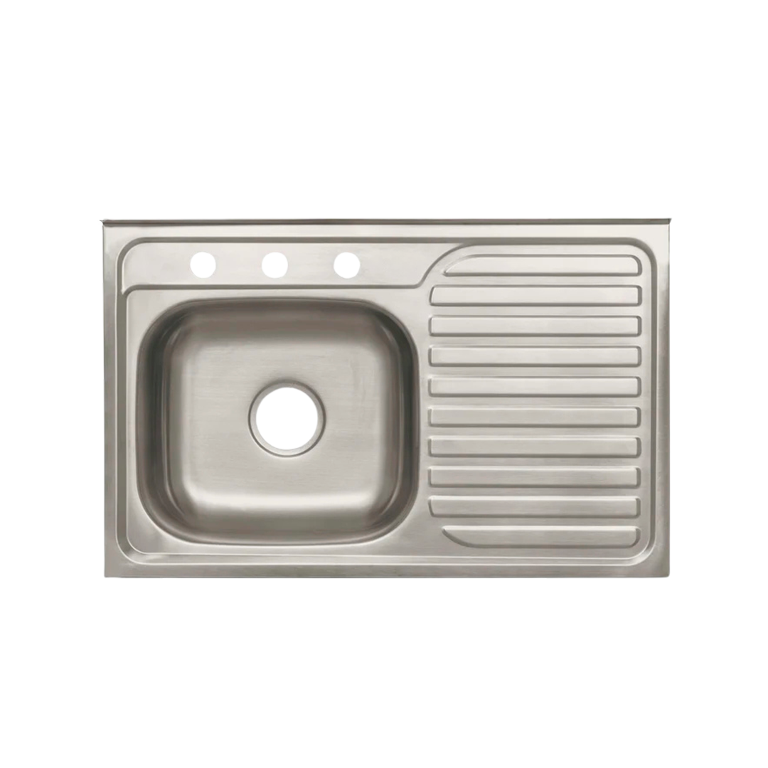 Tarja Bd8050 empotrable de 80 × 50 cm, fabricado en acero inoxidable con acabado satinado. Su tina mide 40 × 34 × 13 cm, ubicada en el lado izquierdo, ofreciendo un amplio espacio para tareas de lavado.