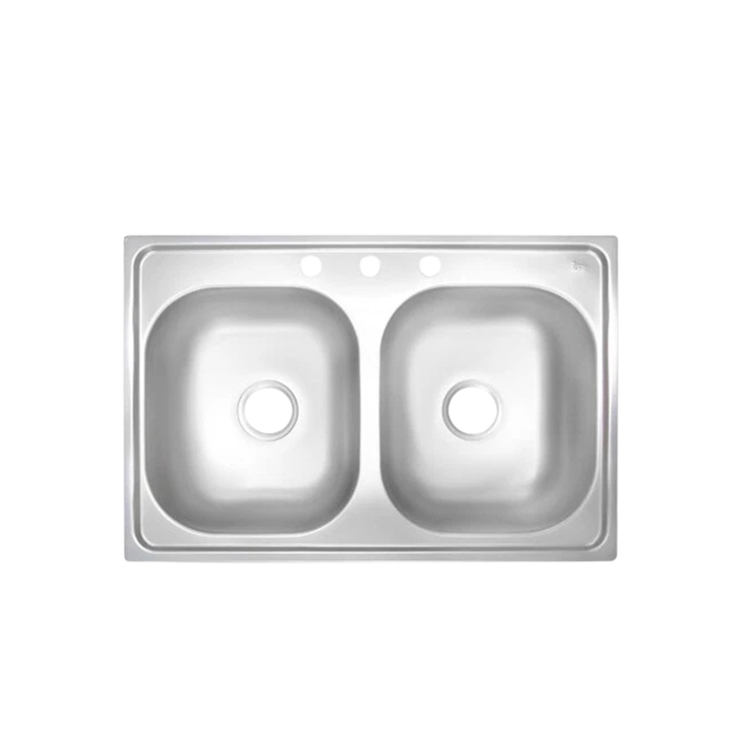 Tarja 840.560 (33.22) 2C 081111126108 de acero inoxidable pulido con dos tinas de 38×42 cm y 20 cm de profundidad, ideal para cajones de cocina de al menos 80 cm. Se instala desde arriba (empotrable), incluye hasta 3 perforaciones para grifería y está respaldada por garantía de por vida en acero